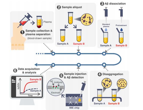 虽然对可能的治疗方法的研究仍在继续,但在症状出现之前,人们也在努力寻找一种诊断这种疾病的方法。先前的研究已经表明Aβ能够从大脑进入到血液中,这表明血液测试可能是一种检测这种疾病的方法。不幸的是,这个想法还没有成功,因为没有办法确定血液中的Aβ水平是否可以反应阿尔茨海默病已经开始。
