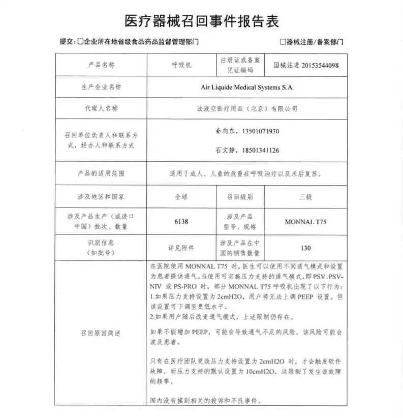 法液空医疗用品(北京)有限公司报告,由于医院在使用MONNAL T75时,当医生使用可实施压力支持的通气模式,即PSV、PSV- NIV或PS-PRO时,部分MONNAL T75呼吸机出现了以下行为:如果压力支持设置为2cmH2O,用户将无法上调PEEP设置,但该设置可下调至更低水平,如果用户随后改变通气模式,上述限制仍存在,如果不能增加PEEP,可能会导致通气不足的风险,该风险可能会波及患者。只有在更改压力支持设置为2cmH2O时,才会触发软件故障,而压力支持的默认设置为10cmH2O,这限制了发生该故障的频率等原因,Air Liquide Medical Systems S. A.对其生产的 呼吸机(注册或备案号:国械注进20153544098)主动召回。召回级别为三级。