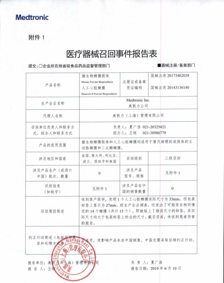 6月21日,药监局官网公布,美敦力(上海)管理有限公司报告,由于涉及产品存在包装标签尺寸与产品不符的问题,生产商Medtronic Inc.对猪生物瓣膜假体Mosaic Porcine Bioprosthesis(注册证号:国械注进20173462038)及人工心脏瓣膜Hancock II Porcine Bioprosthesis(注册证号:国械注进20143136140)主动召回。召回级别为三级。