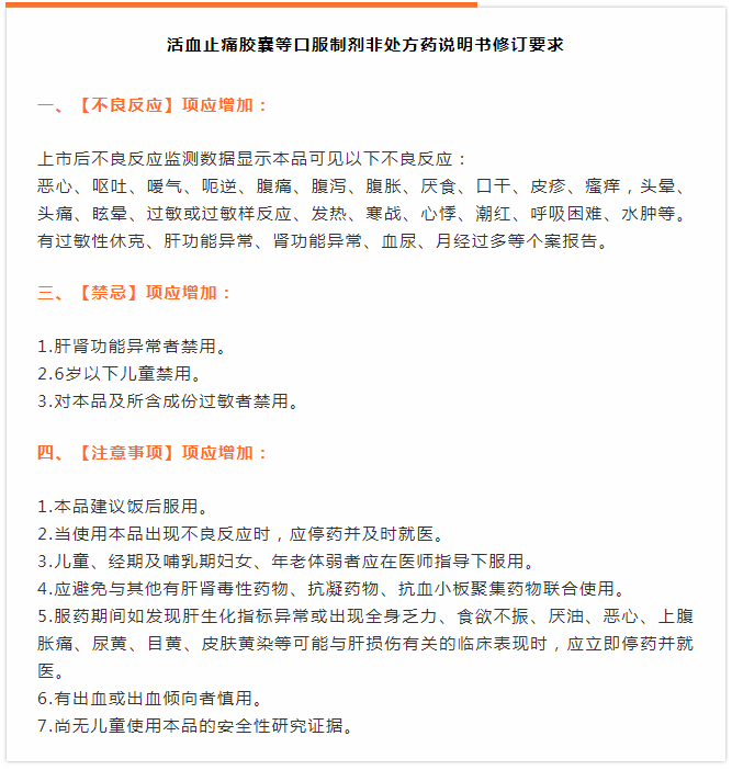 公告内容中指出:根据药品不良反应评估结果,为进一步保障公众用药安全,国家药品监督管理局决定对活血止痛胶囊等口服制剂(片剂、散剂、软胶囊剂、胶囊剂)药品说明书【警示语】【不良反应】【禁忌】和【注意事项】项进行修订。现将有关事项公告如下:
