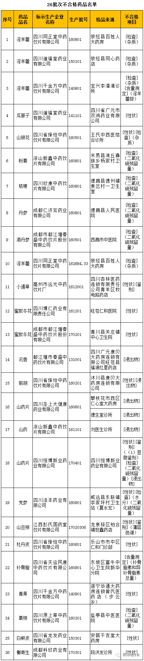 59日消息,四川省药监局发布2018年第2期《四川省药品质量公告》,公告内容中显示有26批次不合格药品。省局要求企业所在地市(州)食品药品监督管理局依据《药品管理法》和《药品管理法实施条例》相关规定,对生产销售使用不合格药品相关企业或单位的违法行为进行立案查处,三个月内公开处理结果,相关情况及时报告省局。不合格药品清单如下: