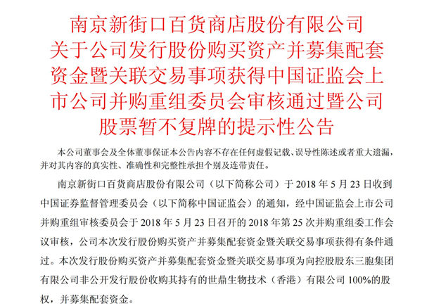 5月23日,对南京新百来说是历史性的一天。从去年11月披露收购预案到今天,历时半年,南京新百终于获得了证监会上市公司并购重组审核委员会审核通过,将FDA批准的首个细胞免疫治疗药物纳入麾下。
